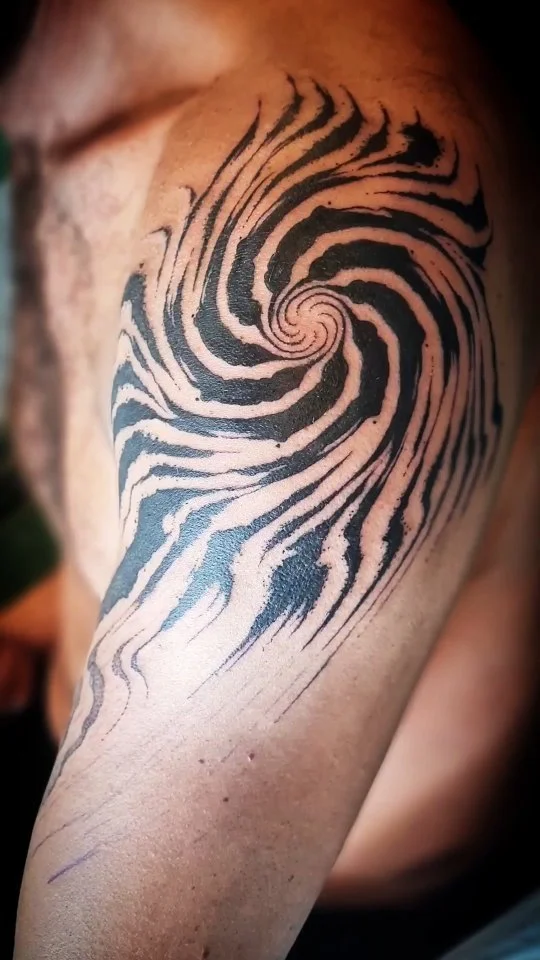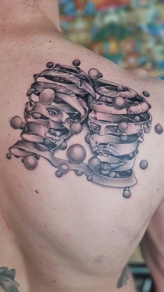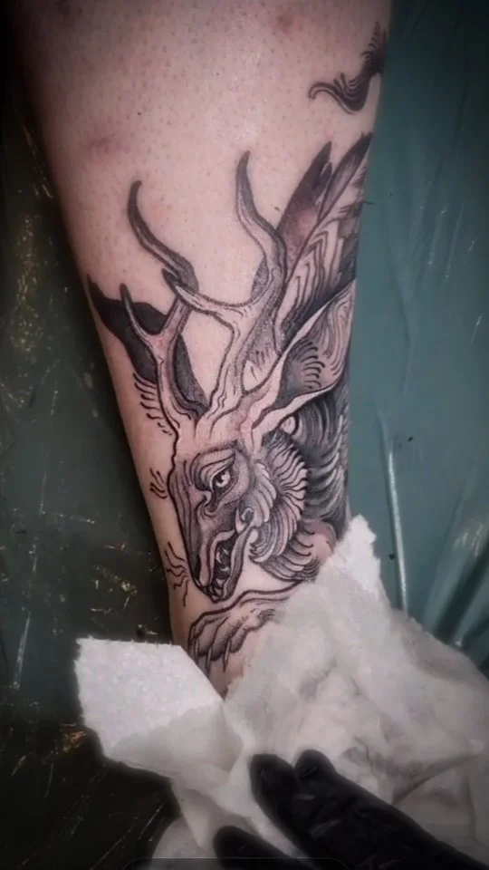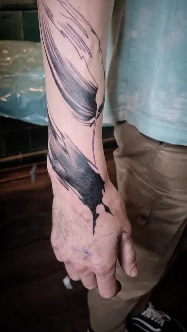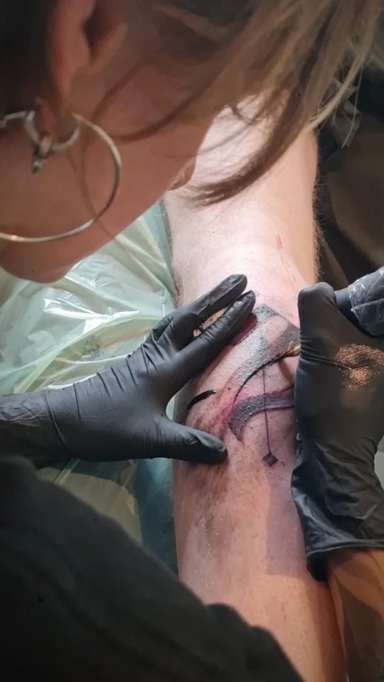 Alex works across a range of styles and enjoys the flexibility this allows each project. Her work spans from illustrative black and grey realism and calligraphy to the more stylised brushwork and large scale abstract and blackwork tattoos. Her main focus is on the balance, flow and textures created on the skin. Alex is strongly influenced by large scale Japanese work which she gives a western spin. She often works with cover ups enjoying the challenge and new direction this can push the design in. This often involves using freehand techniques including painting directly onto the skin to ensure maximum flow with the figure. Painting directly onto the skin allows the tattoo to flow seamlessly with the curves and twists of the body. Capturing the rogue brush stokes, handmade feel of the brush textures and drips in the moment, remaining authentic and unique to each tattoo.